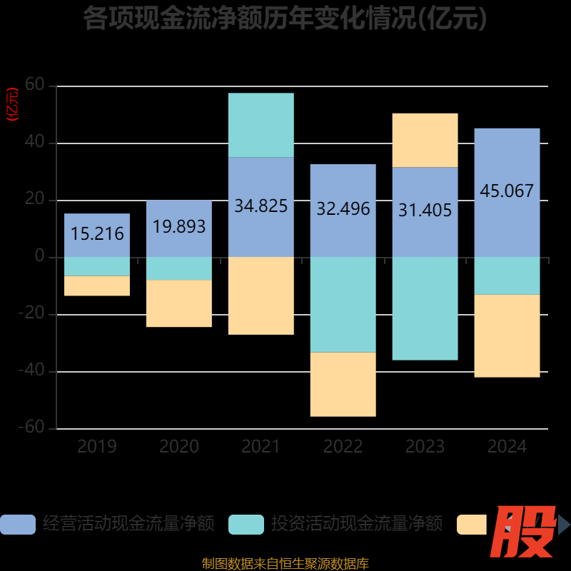 截至2024年,公司经营活动现金流净额为45.07亿元,同比增长43.5%;筹资活动现金流净额-28.97亿元,同比减少47.87亿元;投资活动现金流净额-13.19亿元,上年同期为-36.16亿元。