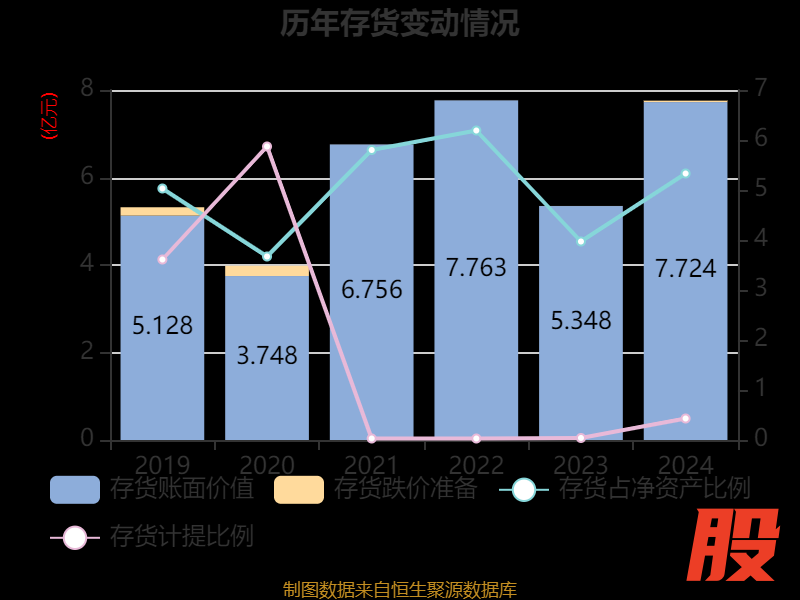 从存货变动来看,截至2024年末,公司存货账面价值为7.72亿元,占净资产的5.33%,较上年末增加2.38亿元。其中,存货跌价准备为330.39万元,计提比例为0.43%。