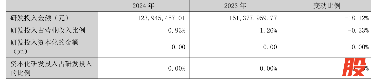 2024年全年,公司研发投入金额为1.24亿元,同比下降18.12%;研发投入占营业收入比例为0.93%,相比上年同期下降0.33个百分点。此外,公司全年研发投入资本化率为0%。